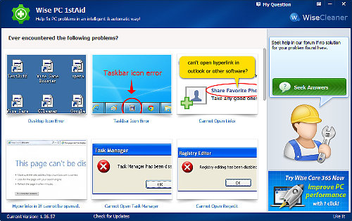 Wise PC 1stAid is a small program that downloads in seconds and takes up little disk space. When it is run, about two thirds of the program window is taken up by a display of thumbnail images, one for each problem.
