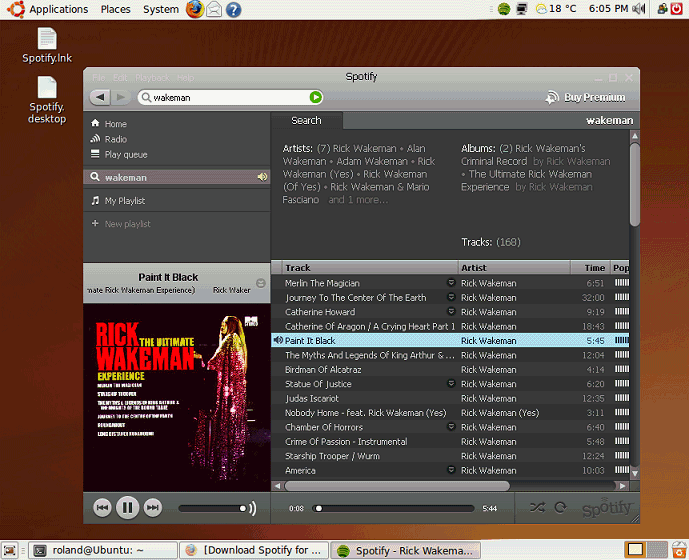 You can do a similar sort of thing in other versions of linux, or even open a Terminal window and enter After installing Wine, find it on the menu and run the Configure Wine tool. Type (The first time you do this the audio system will be set up, which takes a few seconds.) Use full hardware acceleration, 44100 sample rate and no driver emulation. Install SpotifyGo to the Spotify website and follow the download link. Ignore the notice that there isn't a linux version and download the Windows version and save it to your home folder. Open a Terminal window in your home folder and enter