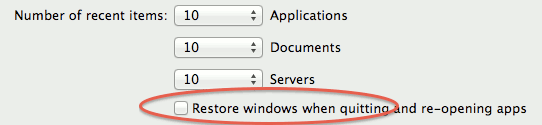 If this hasn't done the trick, some people have found that setting the number of recent documents and applications to zero has cured the problem. Unfortunately, turning off restore windows and setting recent docs and apps to zero will affect everything and not just Safari. This is irritating and it seems like the feature hasn't been thought through properly. Wouldn't it be better if you could enabl/disable the feature an an app-by-app basis? With some apps you might want this feature, but on others you don't. Let's hope for an OS update that fixes this. Another possibile solution is to leave the System Preferences as they are and click the Safari menu and hold down the Option key, which changes certain items. You can then click Quit and Discard Windows. This should stop it remembering the current page so it's not opened next time. Go to Apple Mac and OS X tips and tweaks index...