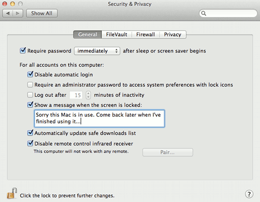 Apple Mac OS X tips and tweaksDate: 5th August 2011 Share this page with your friends! Tweet OS X Lion: Lock the Mac with a custom messageSecurity is an important subject and it is something you need to consider when you own a computer. Normally when people talk about security they only think about online security and hackers, but the physical security of the Mac itself is also important. When you leave your desk to go and get a coffee or for some other reason, can someone get access to your Mac? In those few minute or seconds you are away someone could get on the Mac and steal information. You need to lock your Mac, not just from thieves, but perhaps from the rest of the family too. You don't want your kids to get on your Mac when you aren't looking and accidentally delete valuable files or install some dodgy software. Fortunately, you can instantly lock your Mac and display a custom message on the screen for anyone that tries to access it. It can be a warning to unauthorised people to keep off your Mac or a helpful message to a child telling them to ask mum or dad if they want to use the computer. The first step is to require a password when your Mac is locked. Go to the Apple menu and select System Preferences, then click Security & Privacy. Clic the padlock in the bottom left corner and enter your administrator password - it is necessary for making changes to the security of the Mac. Now tick the box at the top to require a password after sleep or a screen saver begins. Select Immediately from the pop-up option list.