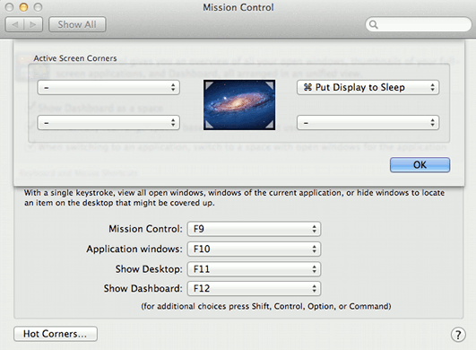 Now you can close System Preferences and try the new features. Hold down Command (if you chose this option) and move the mouse to the corner you selected. The screen will switch off, saving you power, being friendly to the environment, and also locking your Mac. Just move the mouse and you'll see the lock screen displaying the custom message you defined and prompting you to enter your password. (You do have a password set on your account don't you?) Go to Apple Mac and OS X tips and tweaks index...