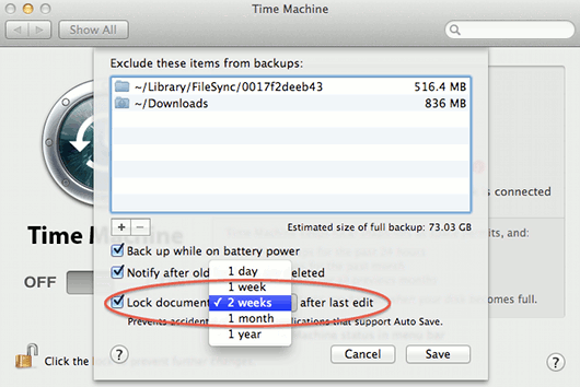 Time machine automatically backs up new and changed files every hour and it is possible that it could automatically back up a file you accidentally or unintentially changed. There is a new setting in Time Machine to prevent this. Go to System Preferences and click Time Machine. Click the Options button and then you'll see Lock documents 2 weeks after last edit. Click 2 weeks and you can choose a different time period. This stops Auto Save from changing files backed up. Go to Apple Mac and OS X tips and tweaks index...