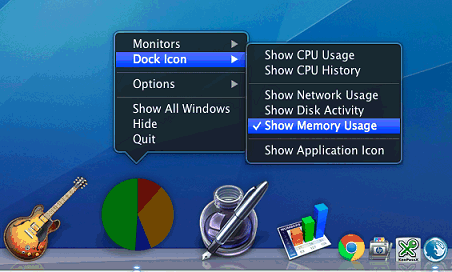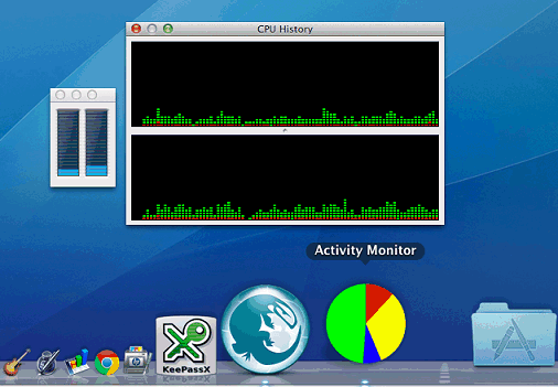 In the screen shot above you can see the memory usage icon that shows how much RAM is free and used. The colours are a bit confusing and the free memory is actually the green and blue areas combined. The memory in use is the red and yellow sectors. (For a fuller description of Mac memory usage, go here.) In addition to showing the usage of various system components in the Dock icon, it is also possible toi display some of the items in floating windows on the desktop too. Right click the Activity Monitor icon in the Dock as before, but this time go to the Monitors menu. There are options to show mini windows displaying the CPU usage and CPU usage history. Try them both. The CPU usage shows each processor core as a separate bar, so you can see when one core is working hard and the other is idle. There is also an option to display a floating CPU window. This is basically a borderless window and you may prefer it to the standard one. It can still be clicked and dragged around the screen to move it, it just doesn't have a title bar or buttons.