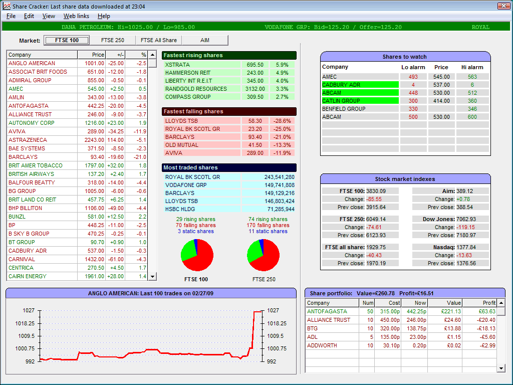 Share Cracker 3 for Windows FreeImportant notice: This is an old program that was originally written many years ago. Sorry, but it no longer downloads share prices from the internet.Share Cracker is a powerful tool for anyone that invests in the London Stock Exchange. It displays stock market information, including the FTSE 100, FTSE 250, FTSE All Share and AIM share prices, various stock market indexes such as the FTSE, AIM, Dow Jones, and NASDAQ. Using this information, you can easily see the best time to invest in shares and when to hold or sell. The program downloads share prices and stock market data from free sources on the Internet and displays the data in an easily digestible form. It displays the fastest rising and falling shares and they can be sorted by name, price, percentage change, volume traded and more.