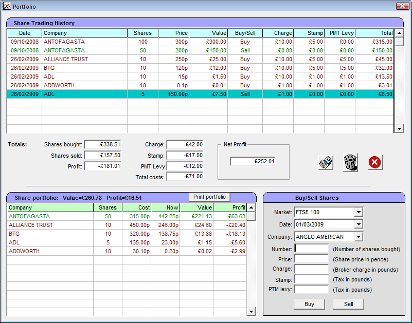 Your share trades are stored and you can review your purchases and sales. All the costs associated with buying and selling shares are included. Currently held shares are displayed in your portfolio and you can instantly see whether they are up or down and how much profit or loss you have made. Any FTSE 100 or FTSE 250 share can be selected and the day's constantly changing price is displayed in a chart. Pie charts show at a glance whether the market is rising or falling. Features: