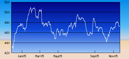 Investing in the stock market using Share CrackerShare ownership has become increasingly common over recent years and perhaps this is because it is so much easier to buy and sell shares and monitor their performance over the Internet. It takes just a few clicks of the mouse to check share prices and display various charts showing the performance of a share over the last day, week, month or year. Although there are lots of great web sites that enable you to view stock market information, they can be tediously slow to use. Switching between companies is often slow with a Web browser, so Share Cracker is much more convenient for many tasks. You may think that the charts in Share Cracker are very basic compared to the ones you can see on some web sites. However, most of the software on this site is written for myself and this is true of Share Cracker. It works the way I need it to work and I find it is a useful investment tool, so let's see how I use it to choose when to invest in the stock market. Find the right companyBelow is the sort of company I am interested in - a high street bank. It's as safe as houses and has a share price that rises and falls over the year. Look along the 460 line and on several occasions throughout the year the share price falls below 460p. I will add a company like this to the watch list in Share Cracker.