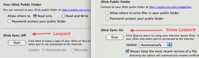 Changes have been made to the iDisk tab though. In Leopard you can choose to allow others to have read-only or read and write access to your iDisk public folder, but in Snow Leopard there is a single tick box to allow others to write to your iDisk public folder. The only thing that has changed here is the wording and the effect of the options is the same. The Leopard version is clearer though because Snow Leopard's option implies read-only access when write access is unticked, whereas Leopard actually states it. iDisk Sync can be automatic or manual, but again Snow Leopard has changed the way this is selected for no apparent reason. It's not better, it's just different. An extra option has been added to the iDisk Sync and you can choose to always keep the most recent version of a file. This is a method for resolving conflicts when you sync two or more Macs and the file with the most recent time and date stamp will replace any identically named file. It seems a good idea, although it makes you wonder what would happen if this wasn't ticked. Does it mean that an older file can overwrite a newer one? The Back to My Mac tab has one extra button and this is to open the Energy Saver preference pane. This is so that you can set an option that enables Back to My Mac to wake a Mac in sleep mode (you must be using a network with Time Capsule or compatible AirPort base station). This is useful because you can put the Mac to sleep, yet still have access to it if necessary.