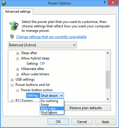 Expand Power buttons and lid. Expand Power button action and choose either Sleep or Hibernation. You may find that one works, but the other doesn't. Closing the lid on a laptop can put it into sleep mode for example, if hybernate doesn't work properly.