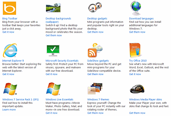 Enhance Windows with a bundle of great downloadsShare this page with your friends! Tweet You buy a PC it comes with Windows pre-installed on the hard disk drive. It is easy to assume that you have everything that there is to be had, but actually you don't. Not everything is included on the Windows DVD or on the disk drive of a new PC and there are lots of extras to enhance the operating system and add more features and tools. They are all available online and if you haven't yet explored Microsoft's downloads for Windows then it's about time you did because you may be missing out on some great software and other free stuff. Go to the US downloads home page or the UK downloads page as appropriate. (Use the Change link at the top of the page if you're from someplace else.) From here you can access the Windows 7 page (US, UK), Windows Vista (US, UK), Windows XP (US, UK), and Windows Live (US, UK) downloads. Windows 7 downloadsSo what is available for Windows 7 users? Well, there are desktop backgrounds, desktop gadgets, Internet Explorer 9, Security Essentials, Sideshow gadgets, a free trial of Office 2010, Windows 7 Service Pack 1, desktop themes, Media Player skins and Windows XP Mode and Windows Virtual PC.