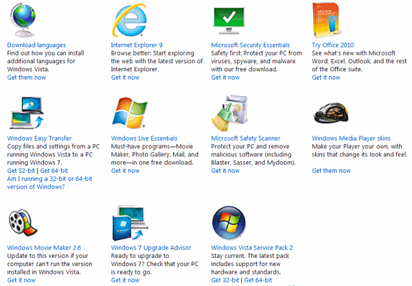 Windows Vista downloadsMany of the downloads for Vista are the same as Windows 7, such as IE9, Security Essentials, Office trial, and so on, but there are some differences and there is Vista Service Pack 2 for example. There is also Windows Movie Maker 2.6, DirectX 9 runtime used for playing games, Windows Easy Transfer for copying your files and settings from a Vista PC to a new Windows 7 PC, Microsoft Safety Scanner for removing malware, and more.
