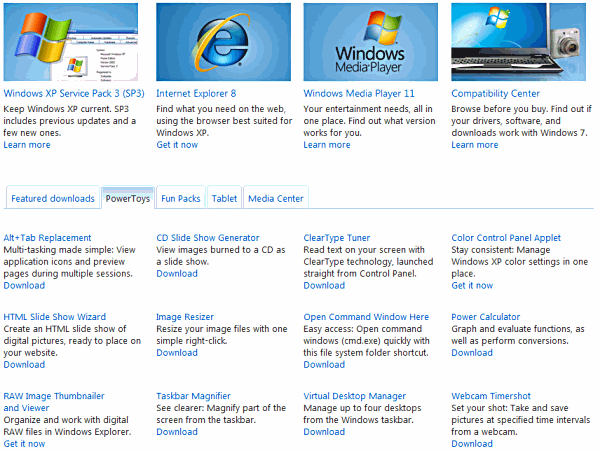 Windows XP downloadsThere is actually more for Windows XP than for Vista and 7 and there are lots of great utilities, programs and resources to download. In fact, there are so many that the downloads page has tabs to organise everything into categories. There are tabs for Featured Downloads, PowerToys, Fun Packs, Tablet and Media Center. There are too many items to list and if you are still running XP you should head over to Microsoft Downloads and take a look at what's on offer. There are some great freebies.