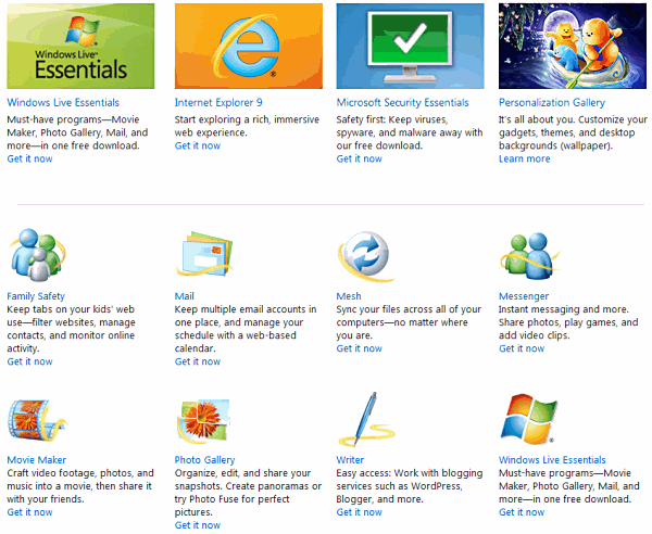 Windows Live downloadsMicrosoft has taken out of Windows a lot of utilities that used to be bundled with it. These are now available as downloads. XP and Vista came with Movie Maker for editing videos, but Windows 7 doesn't have it. Instead, you download it. There is also Messenger, Family Safety, Photo Gallery and Mail. Windows 7 doesn't include an email program! Instead, you download it. Grab all the missing goodies here for free.