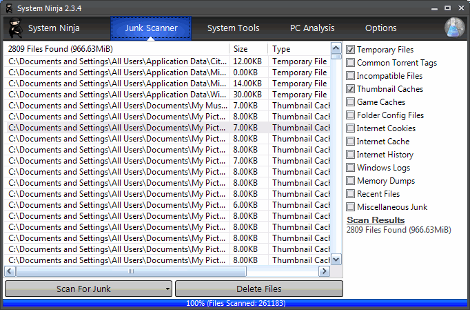 is a simpler tool than JetClean and its cleanup functions are limited to the disk drive. It scans the disk for temporary files, torrent tags, thumbnail caches, internet cookies, caches and history, Windows logs, memory dumps, recent files and miscellaneous junk. Each of the categories of junk can be included or excluded from the scan. When the scan is complete, a list of files is displayed and clicking the Delete button removes them.