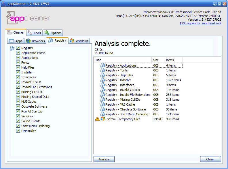 is another utility that is available in a portable version and this means it doesn't add to the clutter you're trying to clean up! The interface is clean and simple. There are two rows of tabs and the top one consists of Cleaner, Tools and Options. Select Cleaner and the second row of tabs lets you select the apps, browsers, registry and Windows system items to be cleaned. Everything has tick boxes, so you can clean as much or as little as you want. After scanning the PC, a list of item categories is displayed. It's not obvous, but each can be right clicked to view the items in the category. You can also right click each category and clean it individually.
