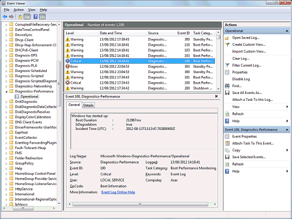 In the top centre pane is a list of events that have been recorded. Look in the Event ID column for 100. This is the Windows startup report and selecting it displays the the boot duration in milliseconds - 1000 milliseconds is 1 second. It may be flagged as Critical in the Level column.