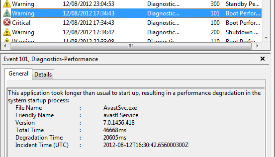 Items related to the startup process have event IDs of 101, 102, 103 and so on. select any that appear in the list and see what they say. You may see something like "This application took longer than usual to start up, resulting in a performance degradation in the system startup process." This will be followed by the name of the offending file.