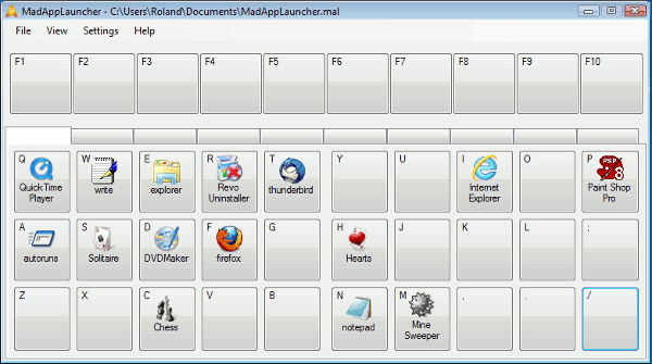 The MadAppLauncher screen shows a keyboard and what you do is to drag and drop programs on the keys. For example, Put Firefox on the F key, Chess on the C key, Internet Explorer on the I key and so on. (They don't have to match, it just makes them easier to remember.)