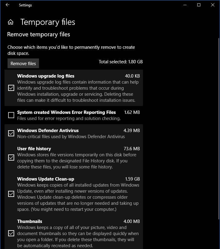 Tick the boxes against any items you don’t want and click the Remove files button to delete them to recover the disk space. All of these temporary files are safe to delete, but check each one because the items in the list can change from version to version of Windows 10. You might want to keep the items in the Recycle Bin (deleted files) for example.