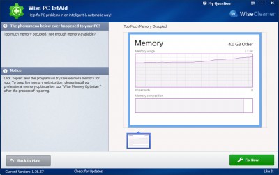 This is a very simple freeware utility that has a limited range of solutions, but the problems they cover are quite common, such as ‘Running speed of PC is too slow’, ‘Too much memory occupied’, ‘Lame internet surfing’ and so on. Wise OPC 1stAid won’t fix every problem you have, but it is still a useful tool to have on your PC just in case.